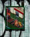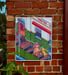 [2 dogs spend a moment seated outside their favourite pub 'The Napier' drawn and coloured in an isometric perspective, hanging on a spray-painted aged fence in the bright sun]